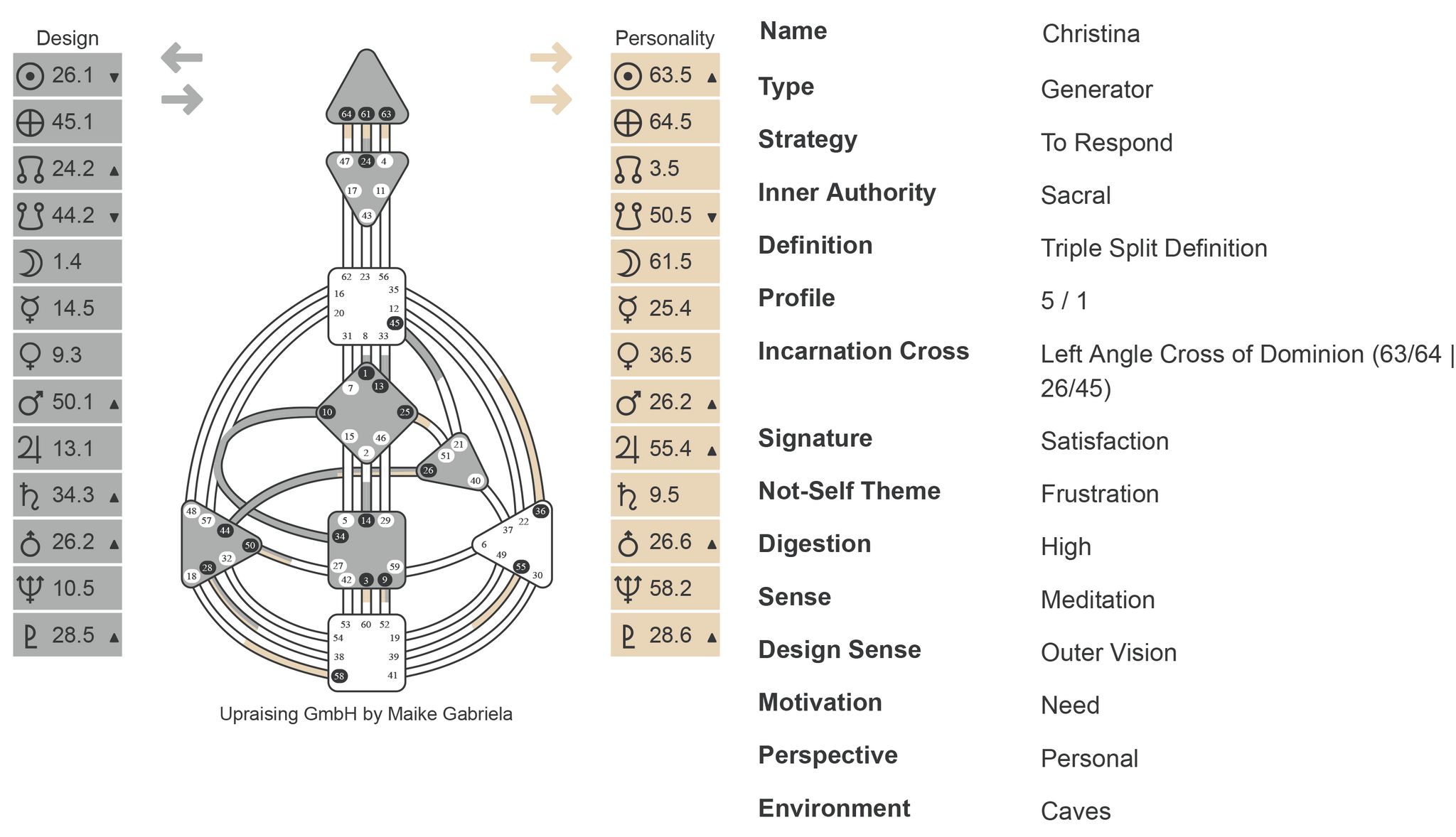 Maike: Human design is the science of our aura. We all have an energetic body that is three meters around us. Everything in our life is matter, meaning everything in our life is energy. Once we understand our own energetic body, we can understand why we have resistance in certain things and how we can move back into flow. Human design is made up of astrology, ancient Chinese knowledge, iChing, Kabbalah, and it also has the chakra systems. Then we add on top genetics and quantum physics. All of this information gives you what we call the body chart.